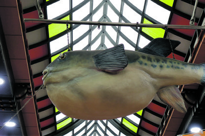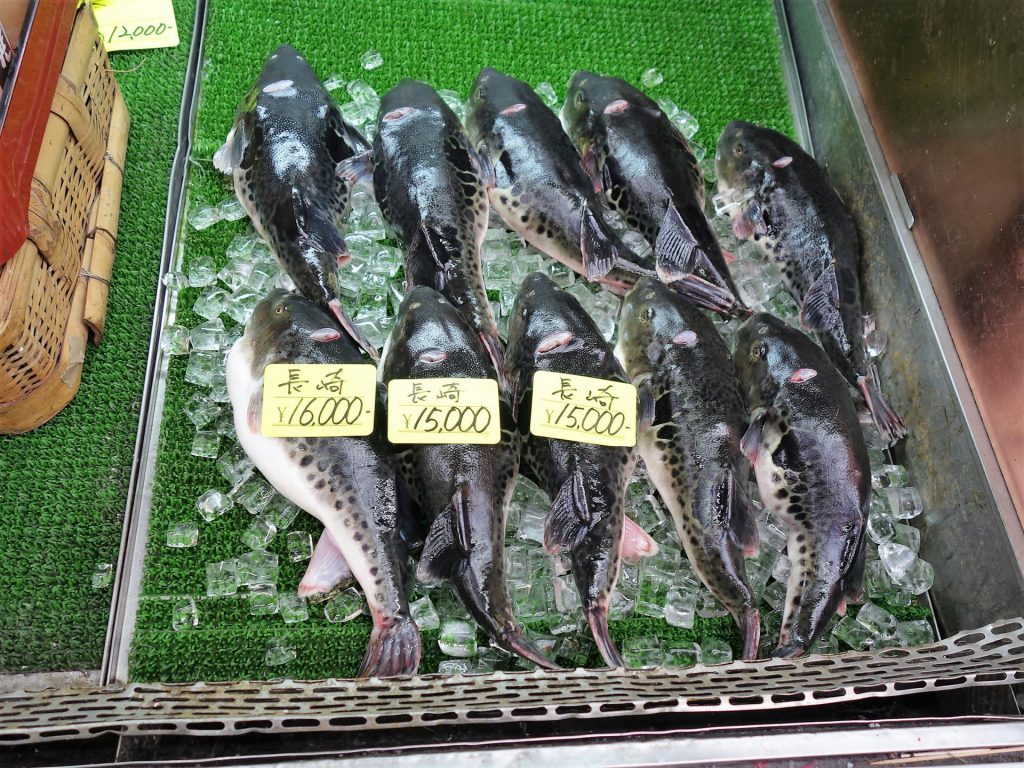 Hvis man tør, er der også fugu, ballonfisk i sashimi-fileter. For japanerne er det den helt store delikatesse, men fordi fisken indeholder giften tetrodotoxin, der kan slå en voksen mand ihjel, eller i hvert fald gøre én rigtig syg, er det kun fiskehandlere med en særlig licens, der får lov til at udskære og sælge kødet, og så er det stadig for egen risiko. Det går lige så godt, så vi vælger ikke at udfordre skæbnen, men springer videre til den mere harmløse tun.