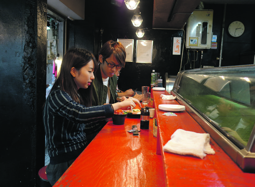 Efter den 30 minutter lange tunauktion er der kun et kvarter til de første restauranter åbner for morgensushi for de friske. Endo er en af de mest kendte, både fordi den har ligget her i 90 år og fordi den serverer fisken på varme ris, der ikke er så hårdt presset som nigiri andre steder, hvilket for nogen gør det til en smagssag for og imod.