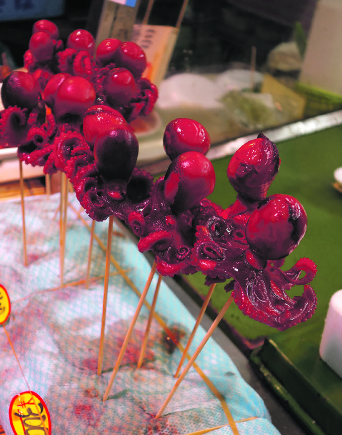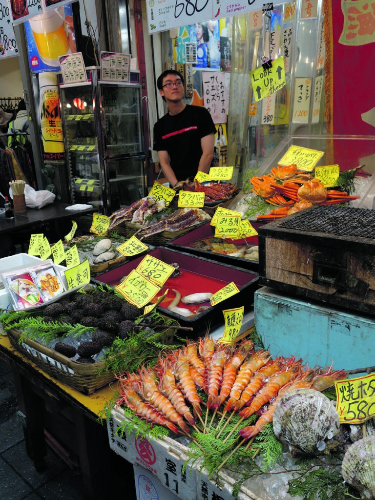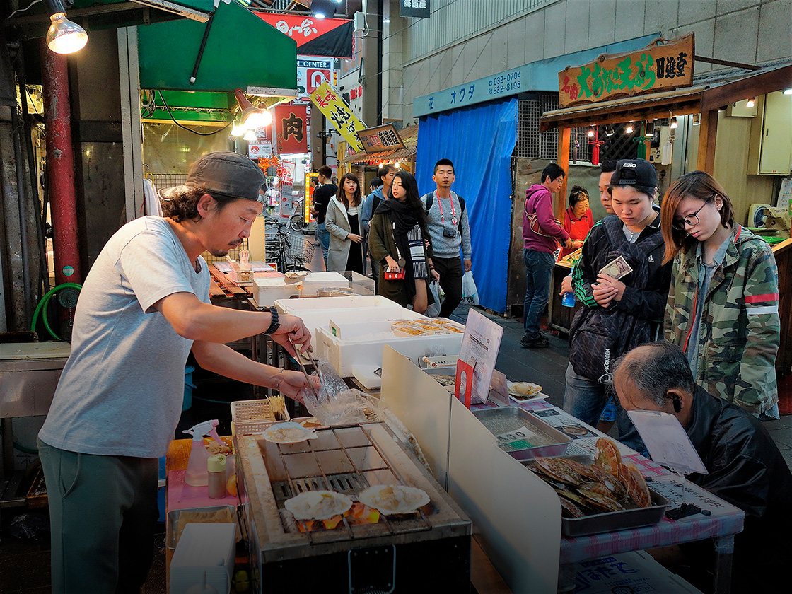 Vi starter vores madmaraton i Kuromon Ichiba sammen med nogle af de 18.000 mennesker, som dagligt passerer igennem det overdækkede fødevaremarked, der har det ypperste i friske råvarer. Ikke kun fisk, men også kød, frugt og grøntsager. Vi går distancen på de knapt 600 meter på verdens dårligste tid, fordi vi skal have det hele med, og det er lige før, at øjnene bliver mætte før maven.