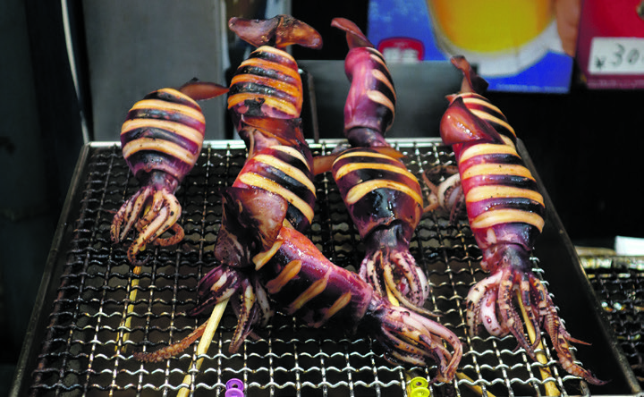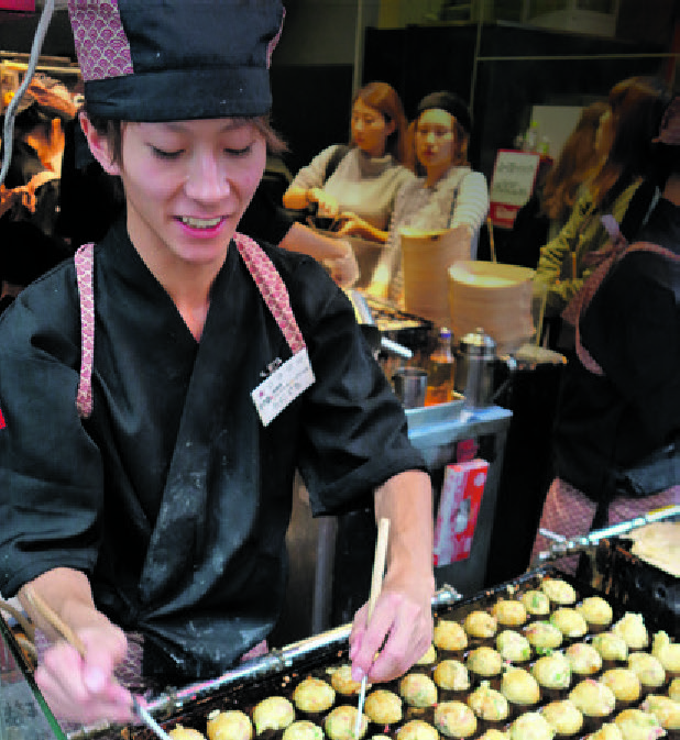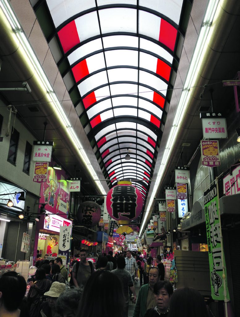 Det er tid til at sætte ind med en slutspurt i Shinsaibashi-suji-arkaden og Dontonbori-gaden blandt japanske lygter, neonskilte og kæmpe-figurer af krabber, fisk og færdig sushi. Det er her, Osaka-borgerne bruger deres lommepenge i de utallige boder med kushikatsu, dybstegte spyd med kød og grøntsager, kitsune odon, en Osaka-suppe med udon-nudler og stegt tofu, horumon, små grillede stykker indmad fra ko og gris, og ikke mindst takoyaki, en slags æbleskiver med fyld af blæksprutte-stykker, som er den mest populære fastfood af dem alle, opfundet i 1950’erne for at undgå madspild.