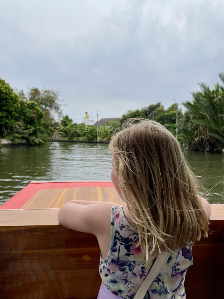 »Tag i stedet en lokal båd, for når I rejser med børn, vil I sikkert også gerne have tid til at se det, I sejler forbi. I vil jo også gerne kunne snakke sammen undervejs, og longtail-bådene larmer helt vildt. Larmen er skidt for jer, og faktisk også for folk, der bor ved Bangkoks floder, så de lokale både er win-win« .