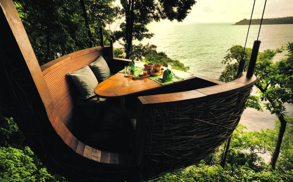 Det er eksempelvis en gigantisk bambuskurv med plads til fire personer, som bliver hejst op i en trætop. Så hænger du i fem meters højde og kan kigge ud over havet og regnskoven, mens en tjener, der er spændt fast til en stålwire, kommer flyvende ude fra køkkenet med maden.