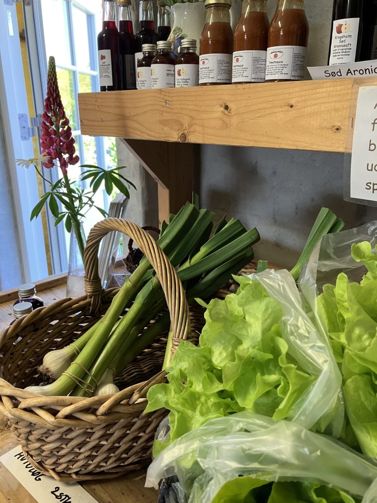 En af den lille gårds længer er indrettet som butik, men holder kun åbent på fredage fra 12-17. Livet leves langsomt her, så én åbningsdag er nok, men det er bestemt besøget værd. Her venter rækker af hjemmelavede marmelader, eddiker, safte, sylt og kurve med nyplukkede salater og nye sommerløg. Friske og tørrede buketter og med en gårdsplads svulmende af sommerblomster til at byde velkommen. Det er lige til at blive glad i låget af. Jeg køber tre glas hindbærmarmelade – de er bestilt af mine børn med mange gentagelser om ikke at glemme dem – en æblechutney, en kirsebærsaft, noget grønt og to bundter små sommerløg, der smager vidunderligt smørdampede til grillet frisk makrel.