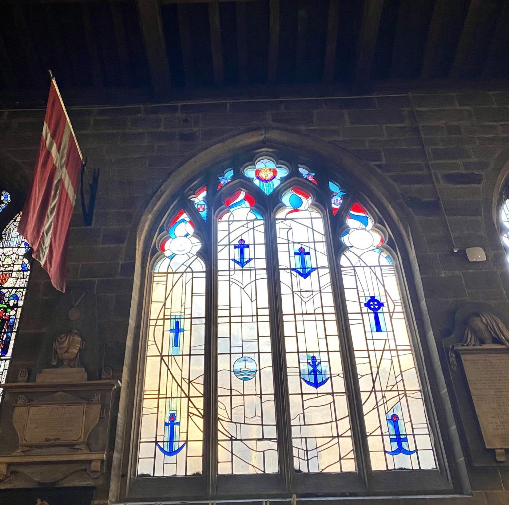 Man behøver ikke at gå duknakket gennem byen af den grund, vi er for længst forsonet. I sådan en grad, at der i middelalder-katedralen St. Nicholas er sat en blyindfattet rude op med maritime symboler for at hædre forliste danske sømænd under Anden Verdenskrig.