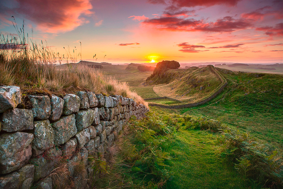Bussen lægger Newcastle Upon Tyne bag sig og sætter kurs mod Nordenglands største attraktion fra antikken, den romerske murfæstning Hadrian’s Wall. Det varer ikke længe, inden bløde marker, skovklædte bakker og stenede vildnis visker indtrykket af moderne tider væk,