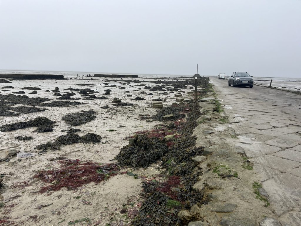 Vejen står under vand halvdelen af døgnet, så det er om at holde øje med skiltene, når man krydser bugten. »Danger« står der advarende med lysende bogstaver og med angivelse af et tidspunkt, hvor man skal være væk fra den 4,5 kilometer lange vej. Vandet stiger hurtigt og kan nå op til flere meter over vejbanen.