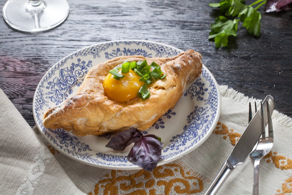 Tag nu for eksempel en georgisk specialitet som Khachapuri. Der er mange varianter af denne ret, men grundlæggende er det et brød med sprøde kanter med en form for oste- og æggesovs i midten. Det er Georgiens svar på en oval Deep Pan-pizza og udgør et helt måltid.