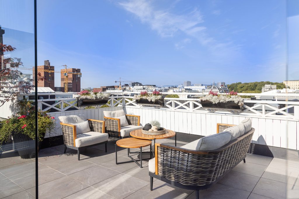 Hun er ved at vise rundt på ottende etage, hvor Grand Penthouse Terrace Suite, der med sin enorme private tagterrasse på 290 kvadratmeter, giver sine VIP-gæster panoramaudsigt over den norske hovedstad.