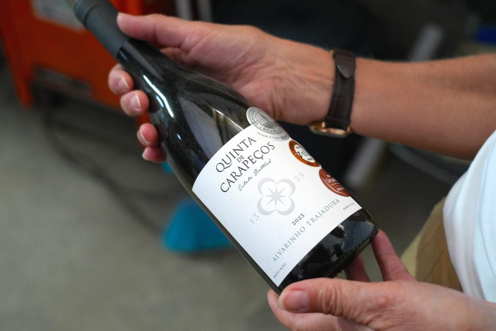 I adegaen (vineriet) tager Eva en flaske vin op af en kasse, og på etiketten står der Quinta de Carapeços med et fint svunget emblem. På bordet står en etiketmaskine, en hyggelig, gammel model med en rulle med klistermærker med etiketten på. Det er ikke så smart og nymodens, men det fungerer – ligesom stålvintankene nede i enden af hallen, der udgør vineriet, hvor vindruerne kommer ind og gennem en lang proces omdannes til liflige vinsmage.