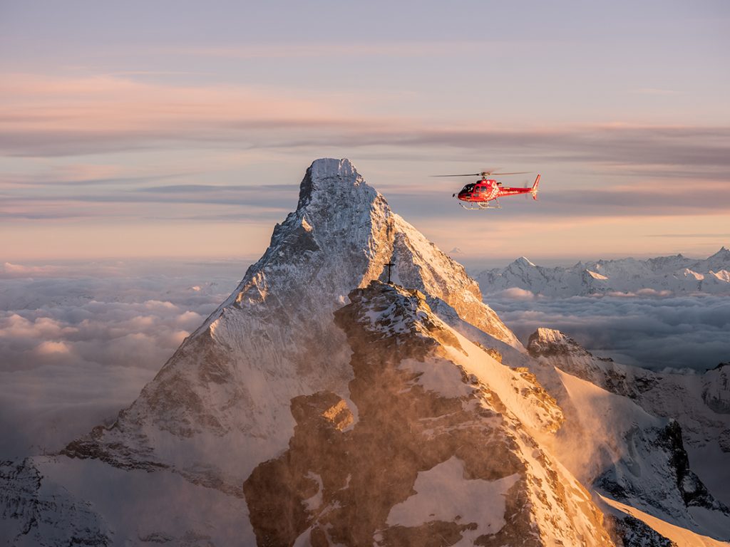 Det ultimative besøg på Matterhorn indebærer naturligvis en bjergbestigning til toppen, men driftige forretningsfolk har fundet en alternativ løsning. For omkring 20.000 kroner kan man købe en helikoptertur, hvor piloten dykker ned i gletsjerdalene og flyver rundt om bjerget et par gange, inden han lader helikopteren ”stå stille” i luften fire meter over Matterhorns top. En dyr, men sikkert effektiv måde, hvis man vil bidrage med en god historie til julefrokosten.
