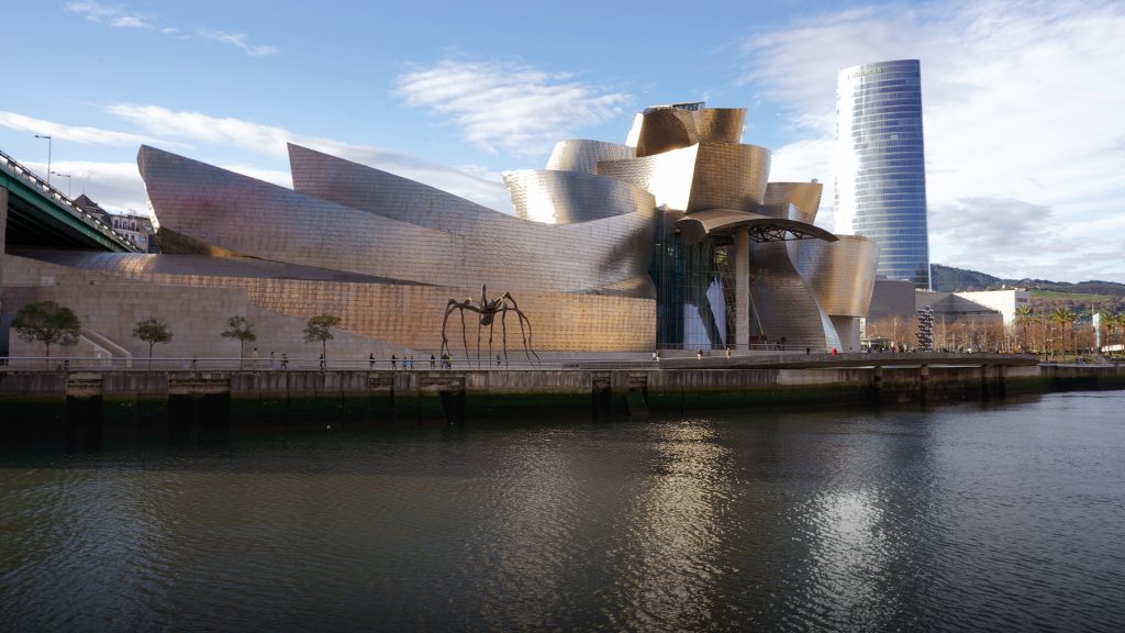 Set fra den lave flodside er det en helt anden sag. Der rejser byggeriet sig som en kæmpehval, og man bliver aldrig færdig med at udforske dens former med de 42.875 lysreflekterende titaniumplader. Derfor er den bedste måde at nærme sig fra promenaden Evaristo Churruca Kaia, hvor der er opstillet vejrbestandige skulpturer som den genkendelige »Maman«-edderkop af Louise Bourgeois.