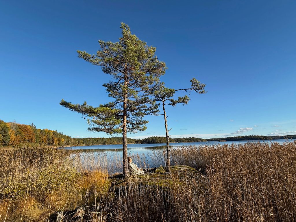 Efter noget tid når vi til en anden større sø omringet af tæt skov. Her overrasker Magnus os på ægte svensk manér. Han har nemlig sørget for fika. Det vil sige eftermiddagskage, kaffe og te. Det nyder vi i solen på en stor stenklippe et lille hop fra fastlandet.