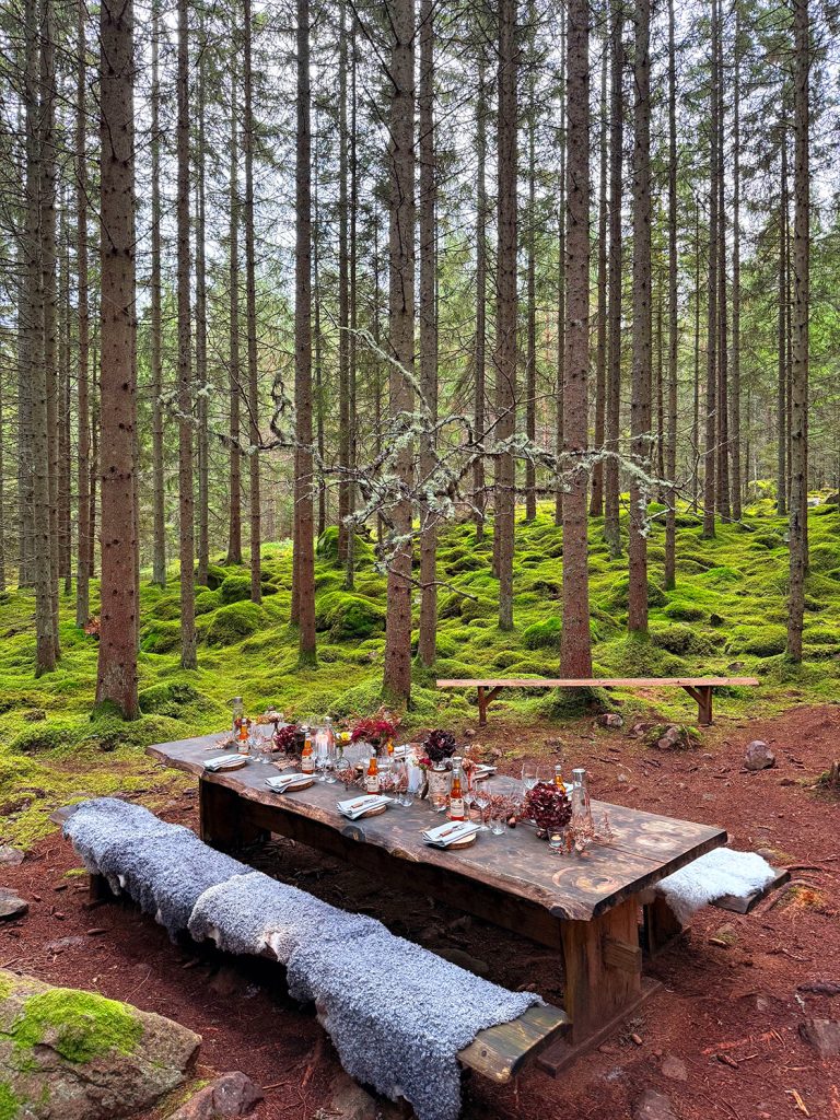 Et ildsted, der blusser op nede i en lille, frodig dal. Her har folk fra Asa Herrgard skabt det mest eventyrlige langbord dækket med stearinlys, farverige blomster, kogler fra skoven og varme skind på træbænkene.