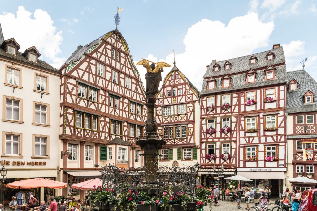 Vi cykler så tæt på vandet, at vi tydeligt hører den dybe dunken fra prammenes dieselmotorer, og vi passerer hotel efter hotel, der alle har udsigtsterrassemit Moselblick foran facaden. Når en af de velbevarede middelalderbyer dukker op, hopper vi af cyklerne og slentrer rundt mellem bindingsværkshuse, kringlede brostensbelagte gader og torve med springvand.