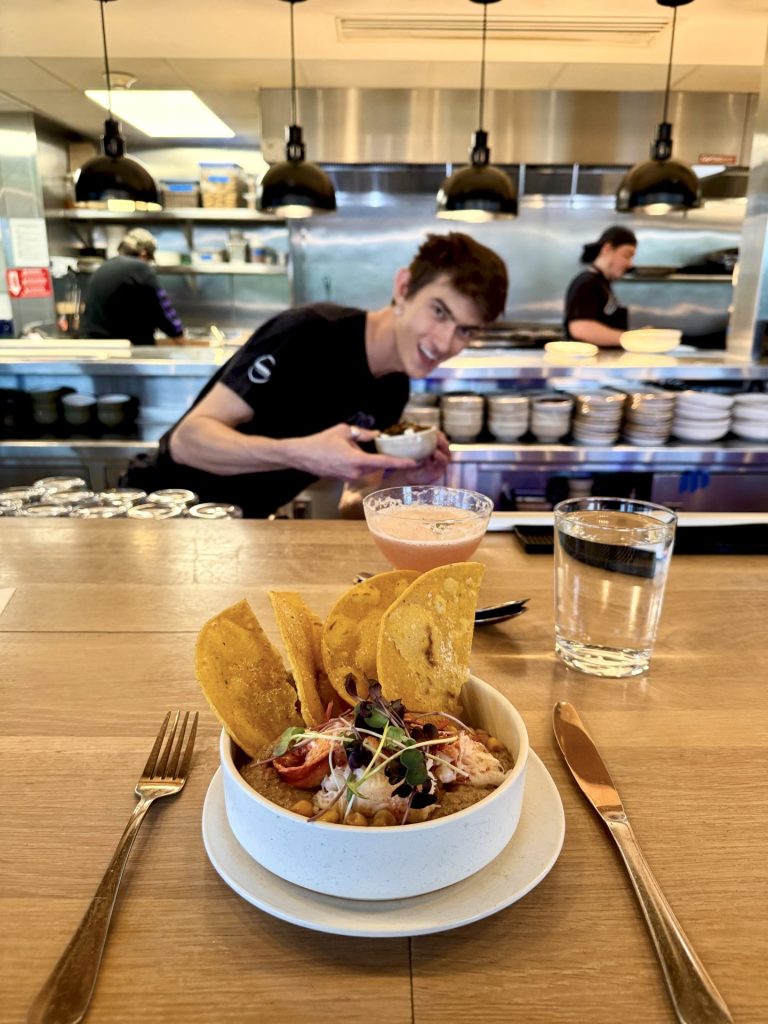 Jeg satser på en portion hvide, søde kartofler med ahorn–chili-crisp og friske forårsløg. Samt en omgang »Bønnedip & hummer«, der bliver serveret med tostadas, syltede løg og majs. Og så bliver jeg nødt til at prøve »Græshopper & Popcorn«.