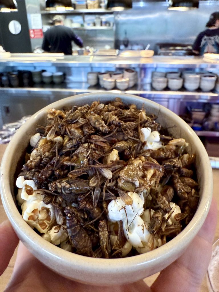 Og så kommer vi til »Græshopper & Popcorn«. Jeg var usikker på, hvad jeg skulle forvente, men det viser sig at være en simpel snack. For det er vitterligt bare en skål popcorn med et lag af sprødstegte græshopper på toppen.