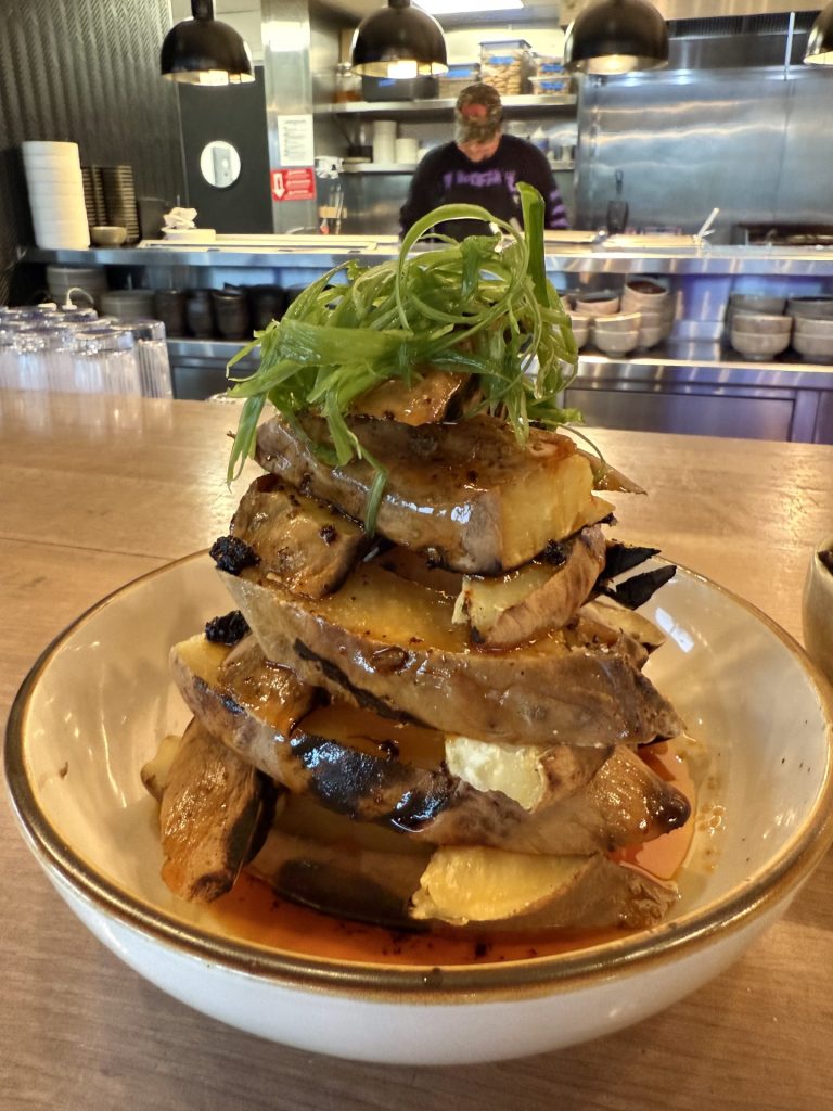 I mellemtiden er maden kommet på bordet. De søde kartofler er grillet, skåret i skiver og stablet i et tårn. Til sidst overhældt med chiliolie og drysset med chiliknas. Det er faktisk mere spicy, end jeg umiddelbart forestillede mig.