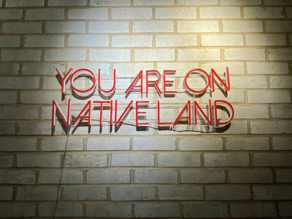 Skiltet, der hænger i lygtepælen ude foran restauranten, er første forvarsel. »You Are On Native Land« står der. Jeg befinder mig på den jord, som tilhører Amerikas oprindelige befolkning.