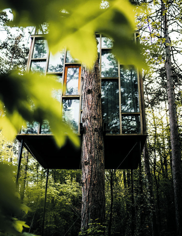 I en lille skov, godt en times kørsel fra Bruxelles, ligger seks minimalistiske, arkitekttegnede hytter opført i tre-otte meters højde i træerne med udsigt over naturen. Hytterne er indrettet med designermøbler og har både varme, vand og elektricitet, men i begrænsede mængder som en opfordring til at skrue ned for forbrug og hverdagsvaner. Her står menuen på slow cooking, og tiden fordrives med at læse en bog eller lytte til fuglene og betragte naturen. ICI, som står bag de belgiske hytter, har også overnatning ved vandet på vej.