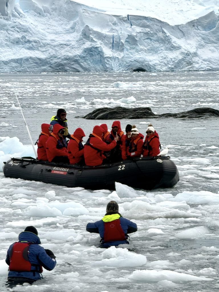 Derfor er 200 gæster på Silver Endeavour perfekt, for mens den ene halvdel af skibet går i land på Antarktis, cruiser den anden halvdel rundt i gummibådene og spotter dyreliv, fx sæler. Efter en times tid bytter de.